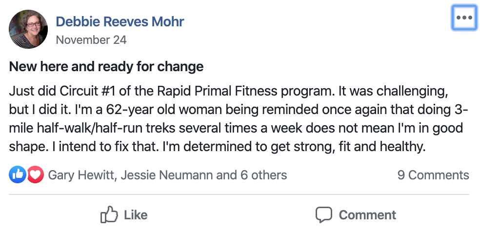 "Lost 30lbs., went from a size 36 to a size 30 waist, gained the ability to do pull-ups, hand-stands and a few other feats… all at age 61!"